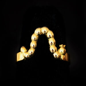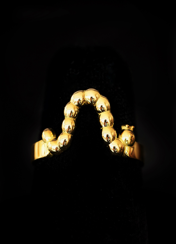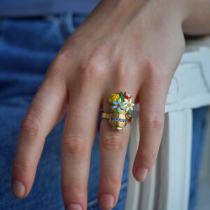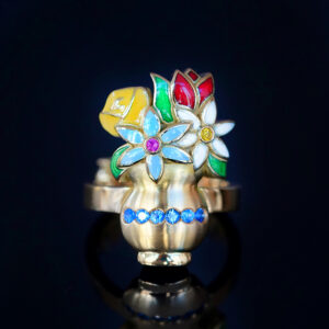 Meaning ‘Little Gardens’ in Italian, ‘Giardinetti’-style rings featuring vases of bejeweled flowers were all the rage in England and continental Europe throughout the 18th century. Slightly larger than its first cousin in the Ursuline collection, this contemporary take on a Georgian-era Rococo design pumps up the volume with vibrant color, glistening sapphires, and a secret golden caterpillar inching across the back!