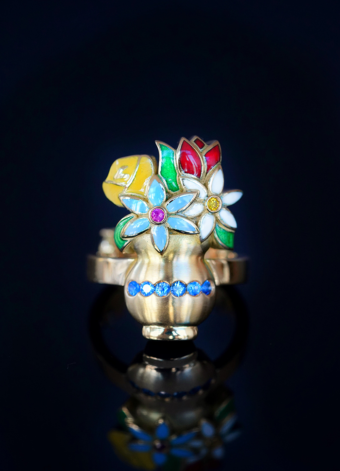 18k yellow gold, hand-applied vitreous enamel, .22 ct Ceylon blue sapphires, .02 canary diamond, .02 hot pink sapphire